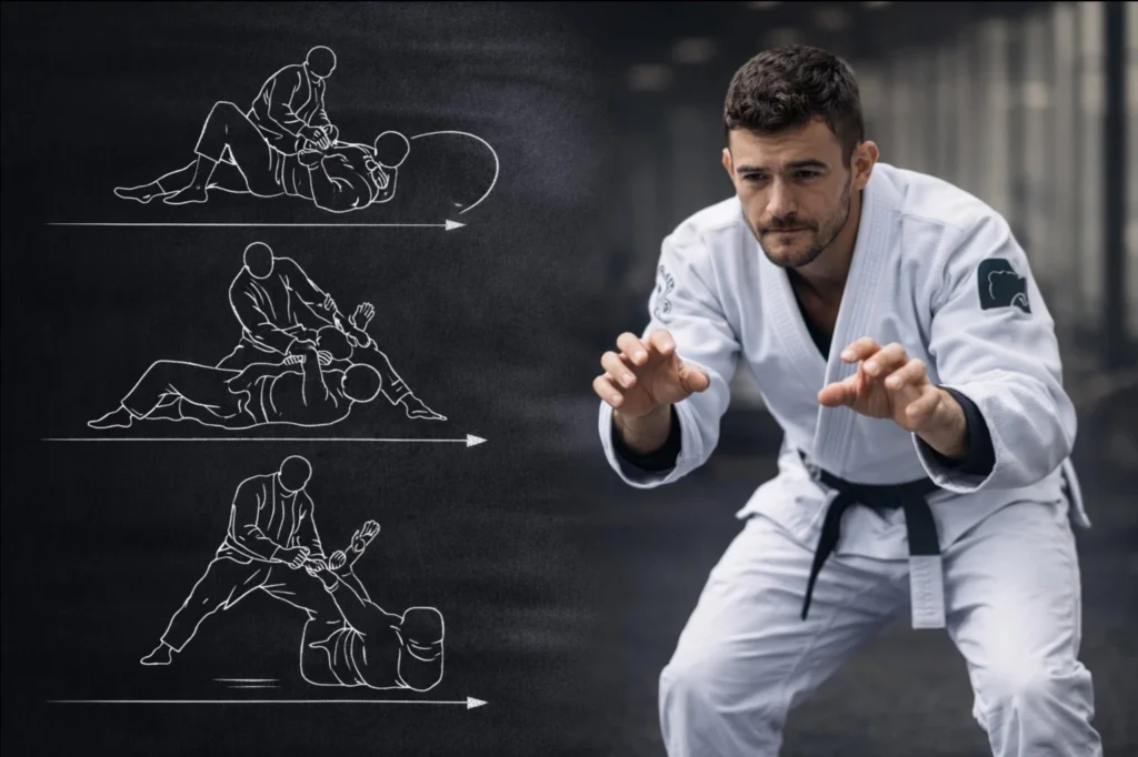 • Para quem está por baixo (o inferno do iniciante): O objetivo aqui não é pânico, mas sim técnica. Você precisa criar espaços, movimentar o quadril e usar os braços e pernas para “armar” as alavancas que vão desequilibrar o oponente e permitir sua fuga.